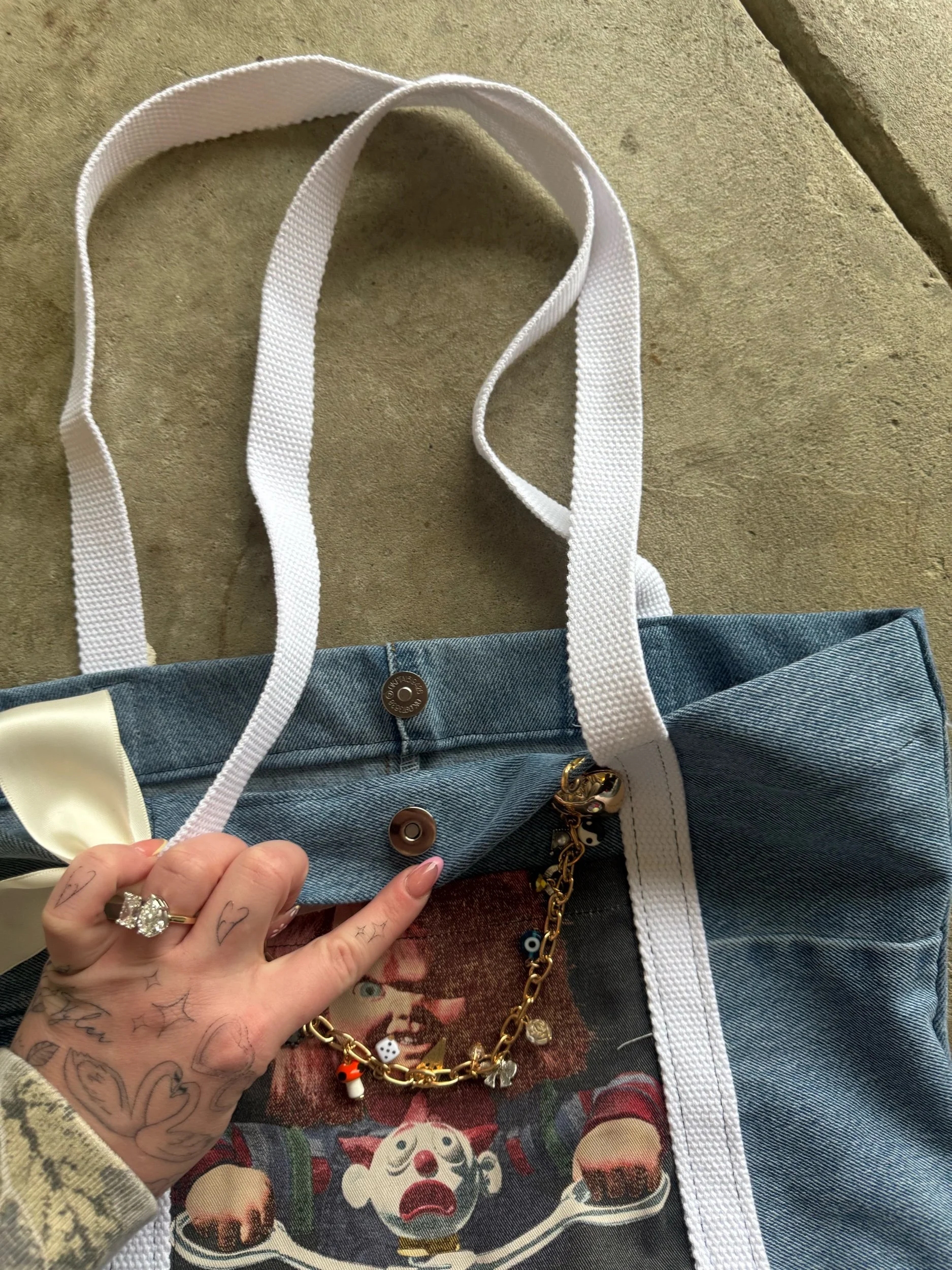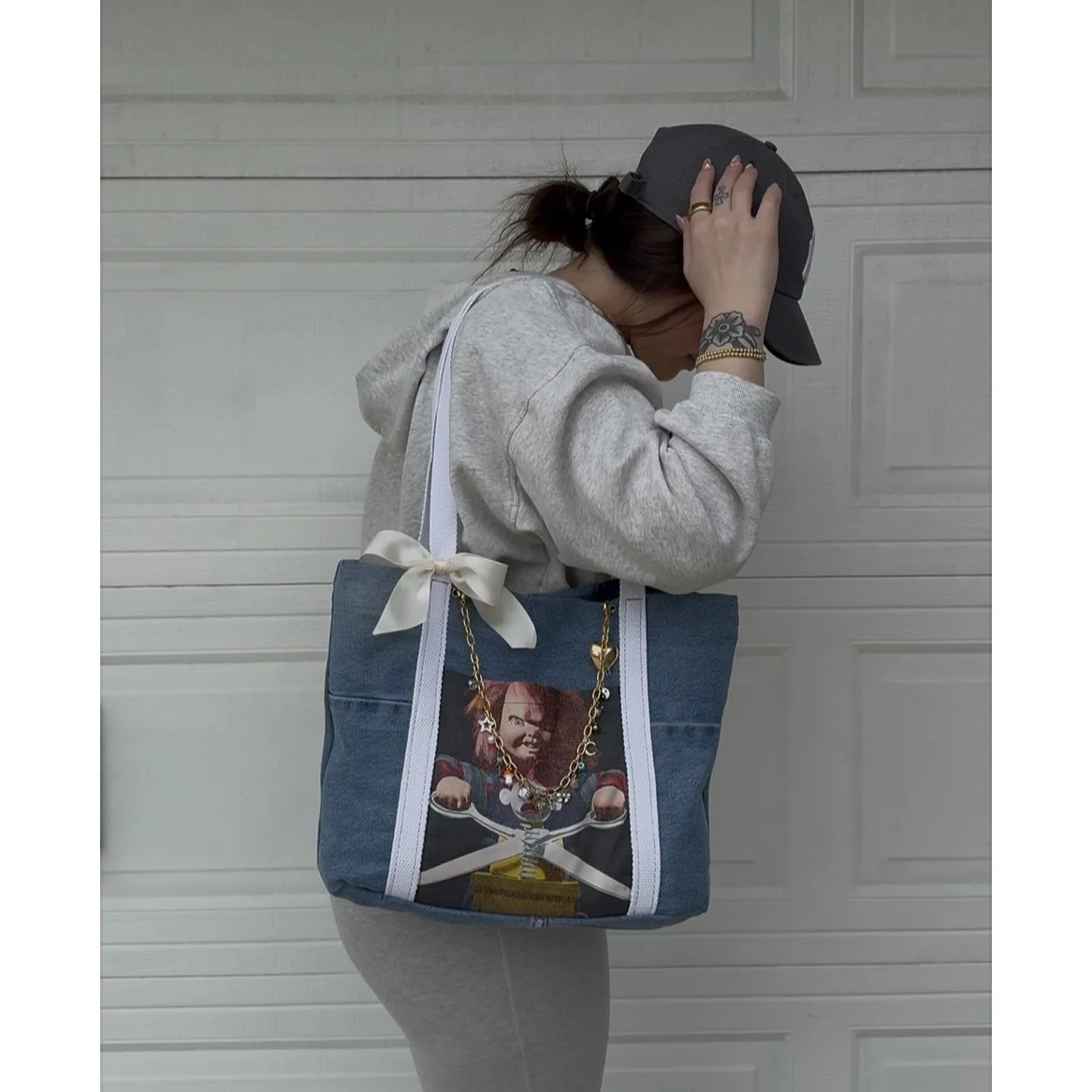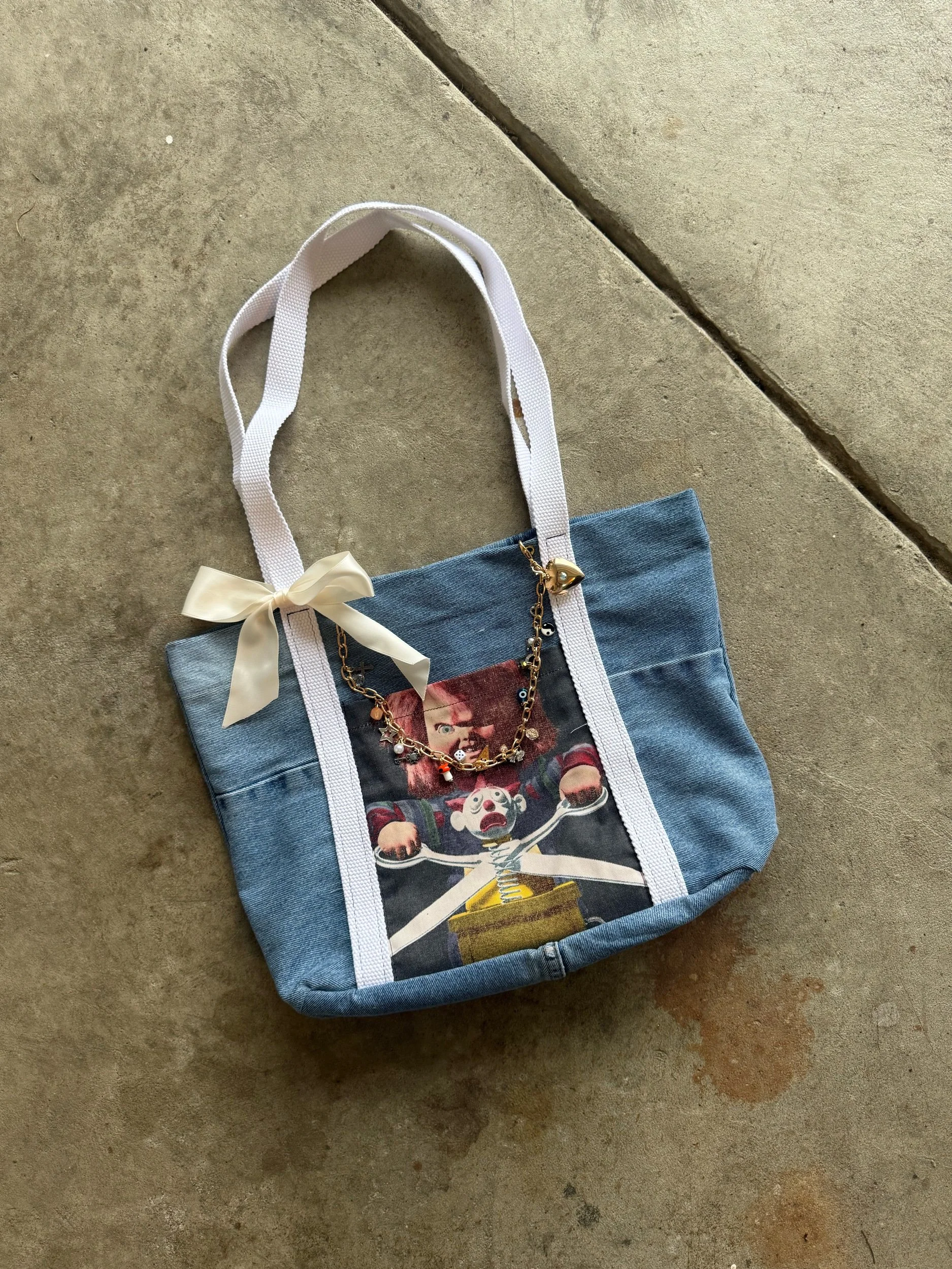 magnetic snap closure, front pocket, two grommets to attach bag charms, lace sides, lace bow & bag charms included